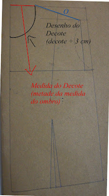 Obs: Desenho do decote e decote são medidas diferentes.  A medida de decote fica na linha  horizontal (marcada pela linha vermelha).  Já a medida que marca o desenho do decote, fica na vertical e é esta linha que "moldamos" ao nosso gosto.