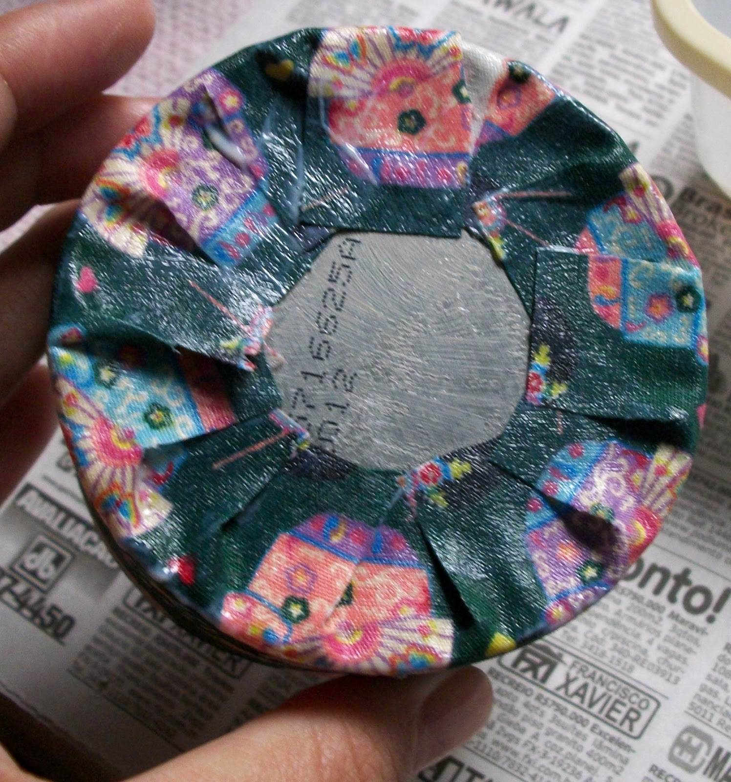 | Não se esqueça cortar o tecido um pouco maior do que a latinha. |
