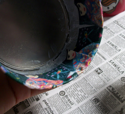 O pequeno truque para fazer com que o tecido se molde perfeitamente à lata é cortar o tecido que sobrou e somente depois começar o processo de colagem. Resista à tentação de colar o tecido todo para a parte interna da lata pois dessa forma o tecido não ficará moldado à curva da lata. Além desse truque deixar o acabamento muito mais bonito ele deixará o seu trabalho muito mais fácil também ;)