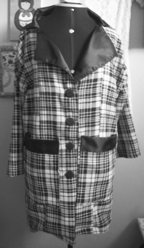 Eu demorei cerca de um mês para terminar o casaco.  Isso tudo contando os moldes, corte do tecido, errinhos e a costura.  Ele foi feito com flanela e cetim preto, para os detalhes.  Minha avó adorou o resultado, mesmo com um mês de espera!