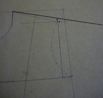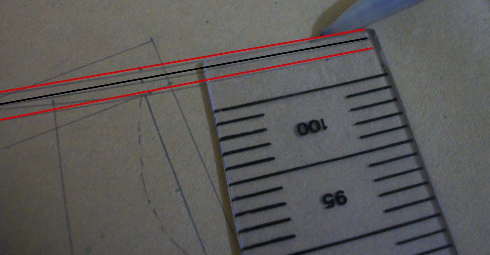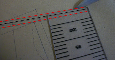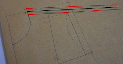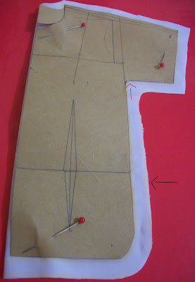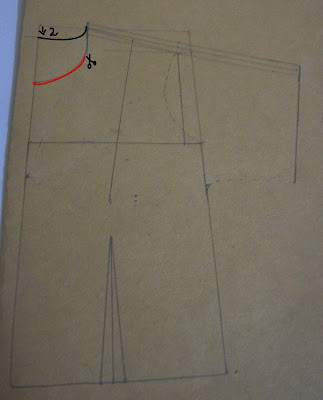 | Molde modificado depois de pronto. Eu marquei em vermelho a parte que aumentei e risquei as pences que não foram necessárias. |